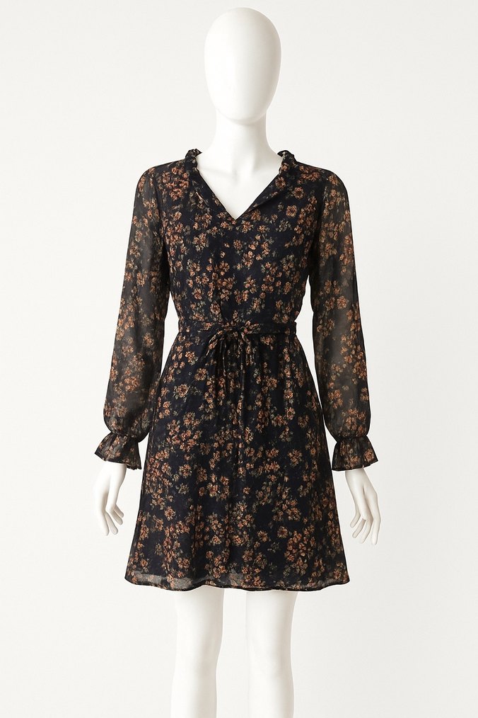 Bohem tarzda, V yakalı ve uzun kollu midi elbise. Kemerli, bol kesim, bej renkli çiçek desenli ve hafif sentetik kumaştan, ofis için uygun.