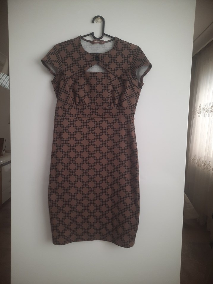 V yaka, kolsuz, kemerli ve baskılı desenli, sentetik kumaştan yapılmış, ofis için uygun midi boy dar kesim elbise.