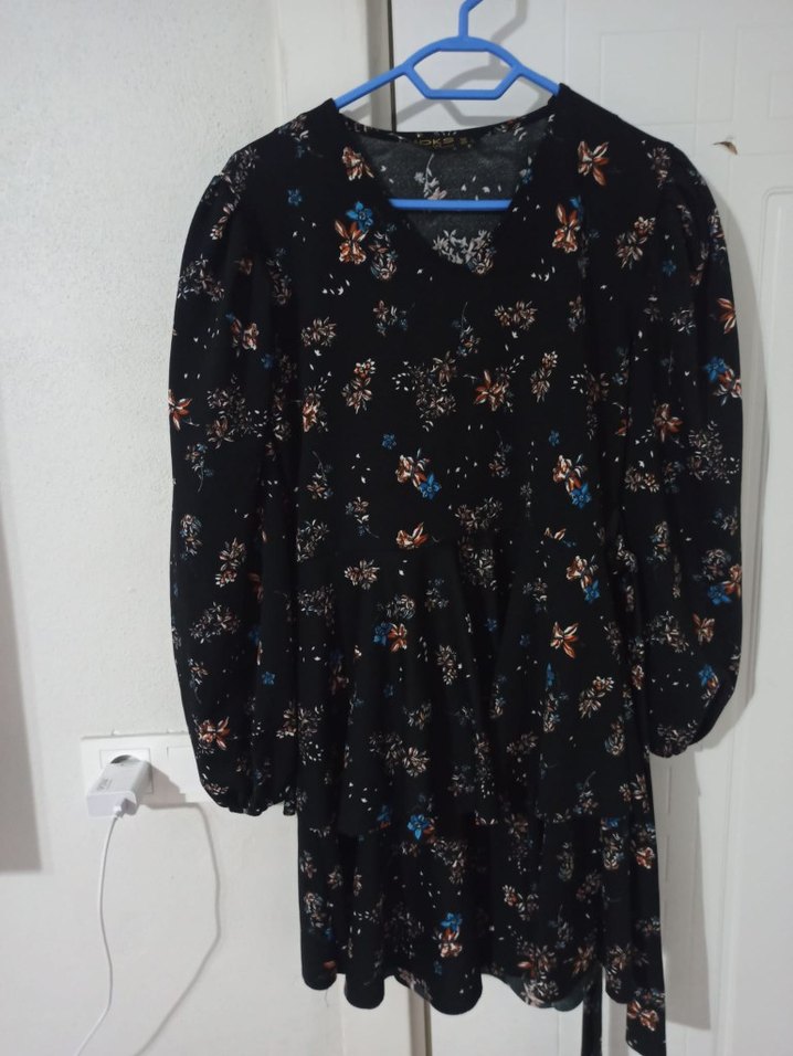 Uzun kollu, V yaka ve kemerli siyah mini elbise, bağlama desenli ve rahat kesimlidir. Günlük sokak stili için uygundur.