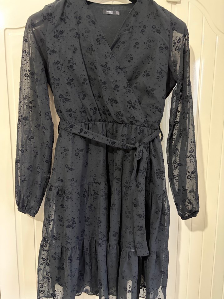 V yaka, uzun tül kollu siyah midi elbise. Kemerli ve bol kesim, ofis için uygun.