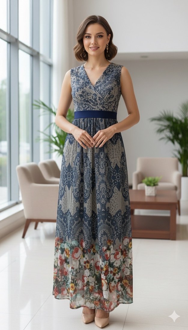 V yaka, kemerli, kolsuz uzun elbise, lacivert ve gri batik desenli, etek ucu çiçek detaylı. Sentetik kumaştan, normal kesim, düğün için uygun.