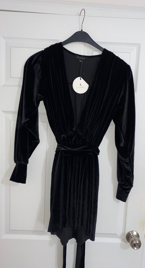 V Yaka Kemerli Uzun Siyah Kadife Elbise