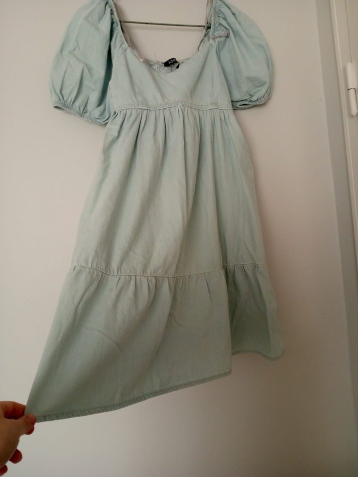 Yumuşak keten kumaştan, bol kesim turkuaz midi elbise. Kısa kabarık kollu, V yakalı ve fırfır detaylı, günlük bohem tarz için uygu