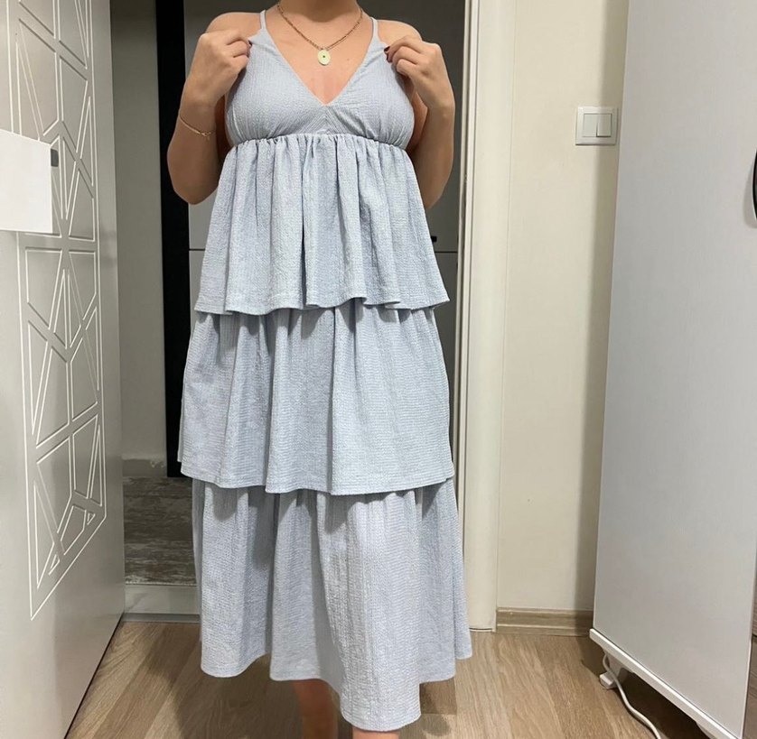 Mavi renk , keten kumaştan, V yaka ve kolsuz, bol kesim, kat kat fırfırlı midi elbisedir. Rahat günlük kullanım için uygundur.