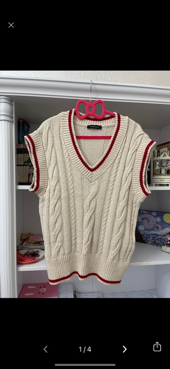 Kırçıllı beyaz örgü süveter, bol kesim ve V yaka ile. Kırmızı şerit detaylar ve kolsuz tasarımı günlük kullanıma uygun.