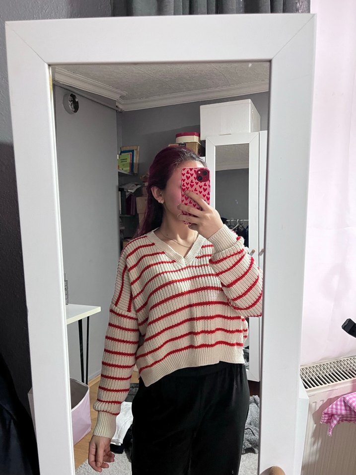 V yaka, uzun kollu, kırmızı çizgili örgü kadın kazak, rahat ve salaş kesimiyle günlük kullanıma uygundur. Midi boyda, konforlu bir görünüm sunar.
