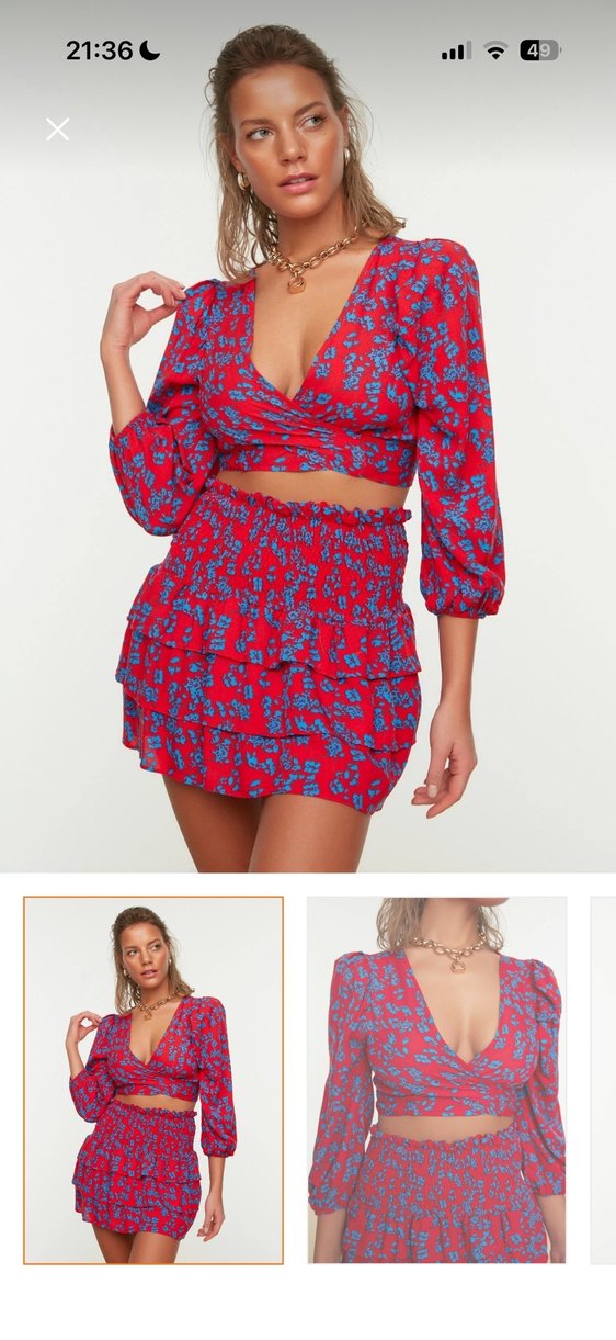 V Yaka Kırmızı Desenli Mini etek takım