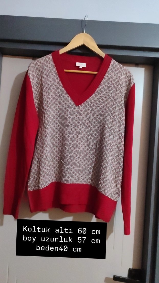 V yaka, uzun kollu, bol kesim kadın kazak. Kırmızı ve gri renklerde, triko örme kumaştan. Günlük kullanıma uygun, rahat ve çağdaş tarzda. Boy uzunluğu 57 cm, beden 40 cm, koltuk altı 60 cm.ön kısmı ipek şifon kumastir