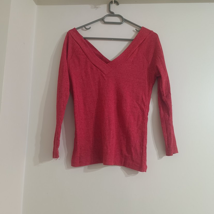 Kırmızı renkli, V yakalı ve uzun kollu ince triko kadın kazak. Dar kesim ve normal boydadır, yumuşak sentetik kumaştandır.