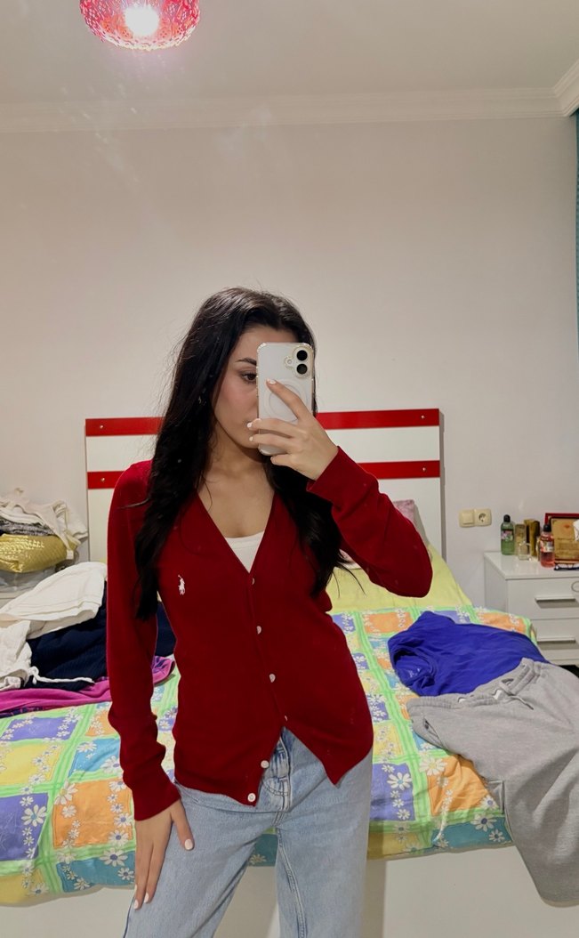 V yakalı, uzun kollu kırmızı kadın hırka, hafif ve sıcak kumaştan, ince kesim ve desensiz tasarıma sahip. Günlük rahat kullanıma uygun, zahmetsiz şık tarz sunar. ORİJİNAL