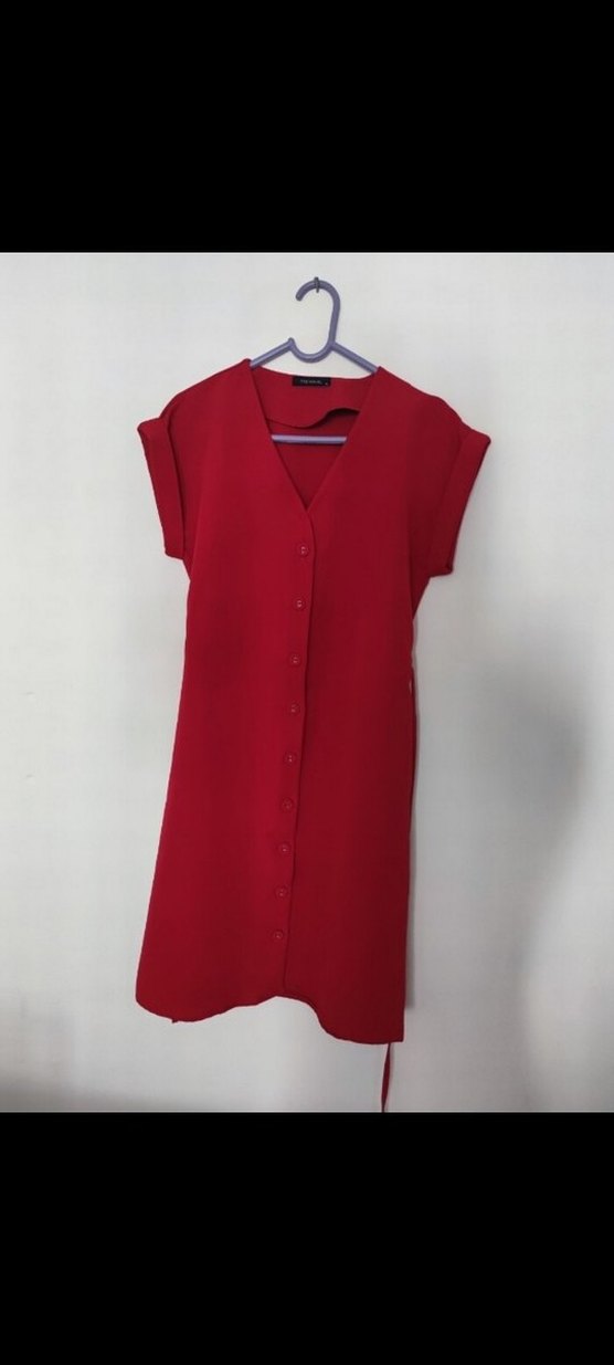 Kırmızı midi uzunlukta, V yakalı ve düğmeli kadın elbisesi. Kısa kollu ve bol kesim, sentetik kumaştan üretilmiştir, günlük kullanım için uygundur.