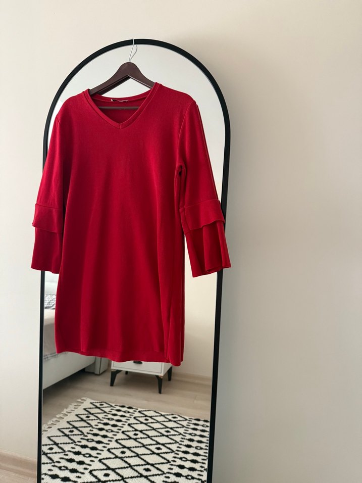 V yaka ve katlı manşetlere sahip kırmızı midi triko elbise. Rahat kesimi ve yumuşak, sıcak kumaşıyla günlük kullanıma uygundur.