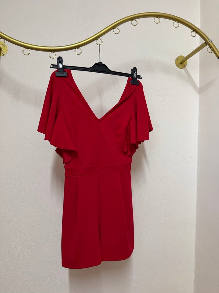 Parlak kırmızı, v yaka ve drapeli kısa tulum, ince askılı kollara sahip, romantik akşamlar için ideal. tam bir yılbaşı elbisesi ❤️