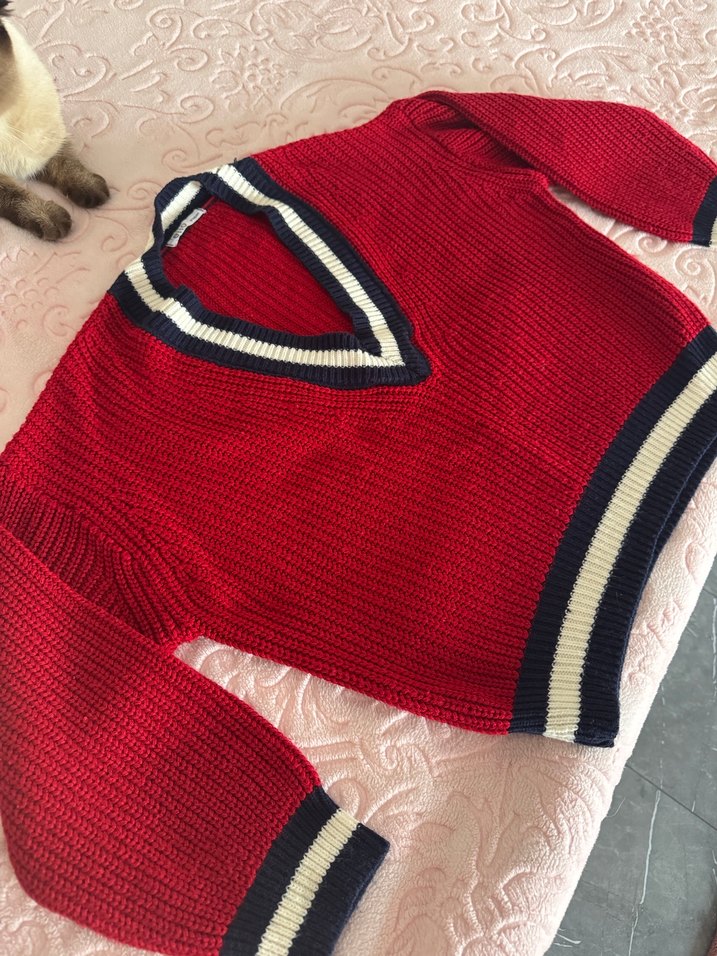 V yaka ve uzun kollu, kırmızı renkli, örgü dokulu, kol ve yaka uçlarında çizgili detaylara sahip güzel bir kazak