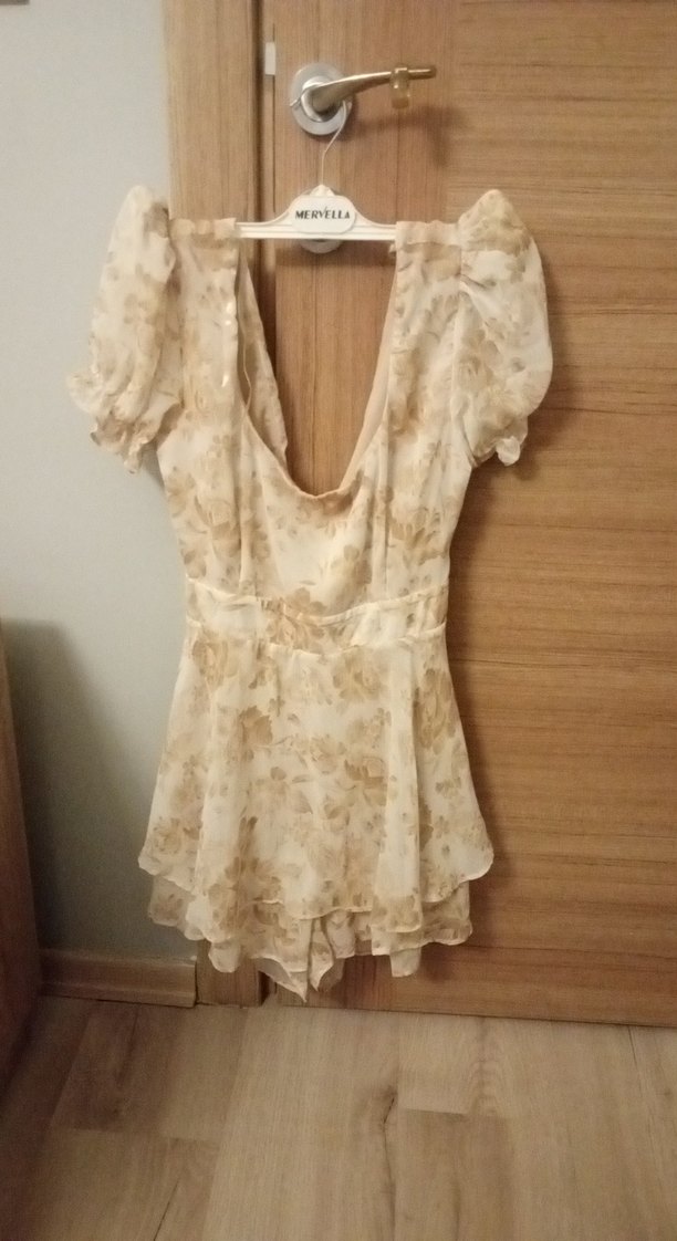 Bej renkli, kolsuz kısa tulum, bol kesim ve drapeli kumaş ile V yakaya sahiptir. İpek gibi yumuşak kumaştan, pastel batik desenlidir, vintage bohem tarzını yansıtır, düğünler için uygundur.