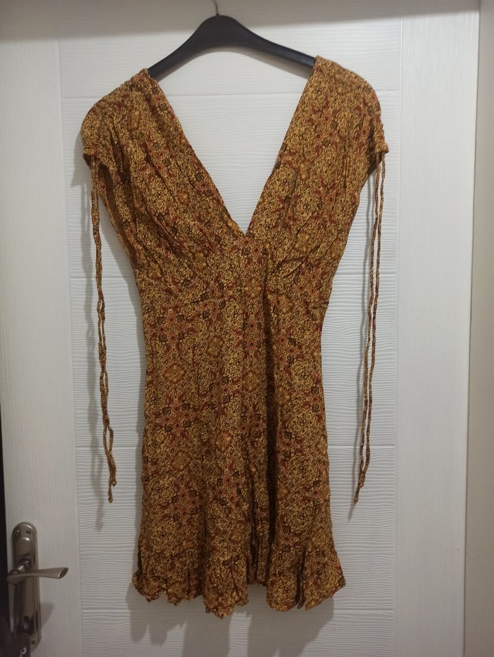 Derin V yakalı, dökümlü tasarımlı kısa kahverengi bohem elbise. Kolsuz ve bol kesimli, bağlama desenli, yumuşak sentetik kumaştan yapılmıştır.