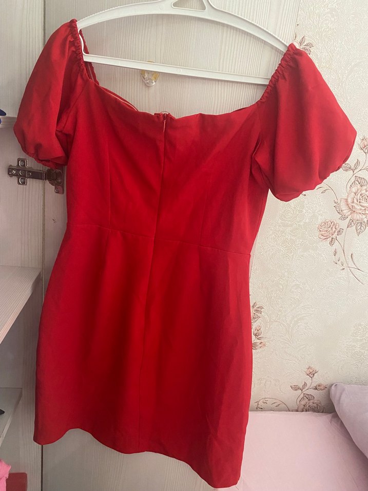 V yaka, kısa balon kollu kırmızı mini elbise, düğmeli detaylarla. Parlak sentetik kumaştan, romantik akşamlar için cesur bir seçim.