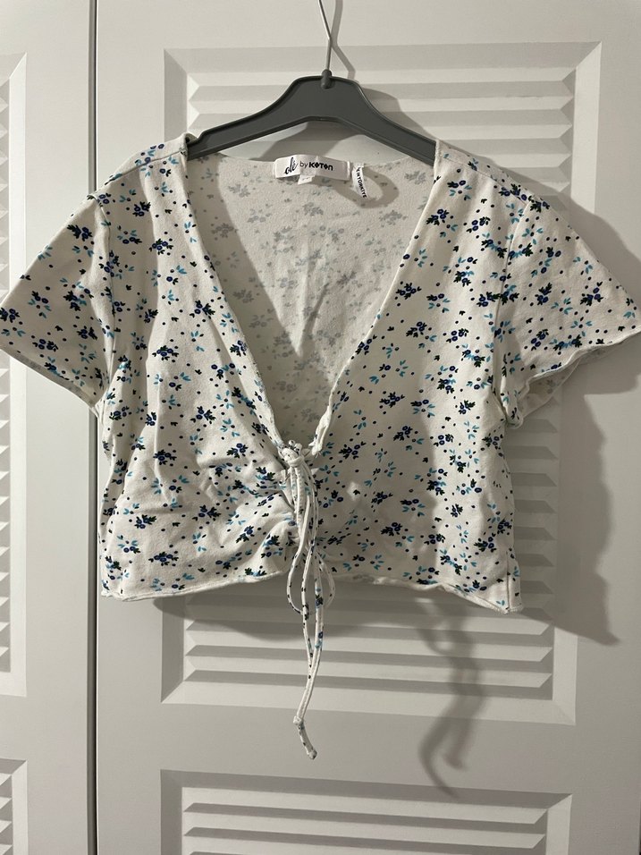 Pamuk kumaştan, V yakalı ve kısa kollu, önünde bağlama detayı bulunan, gri-beyaz tonlarında çiçek desenli, günlük sokak stiline uygun kadın bluz.