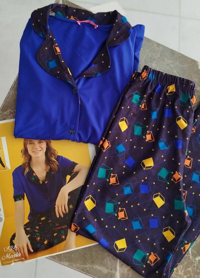 Lacivert V yaka kısa kollu üst ve renkli geometrik desenli baskılı bol kesim kadın pijama takımı. Rahat ve şık uyku kıyafeti.