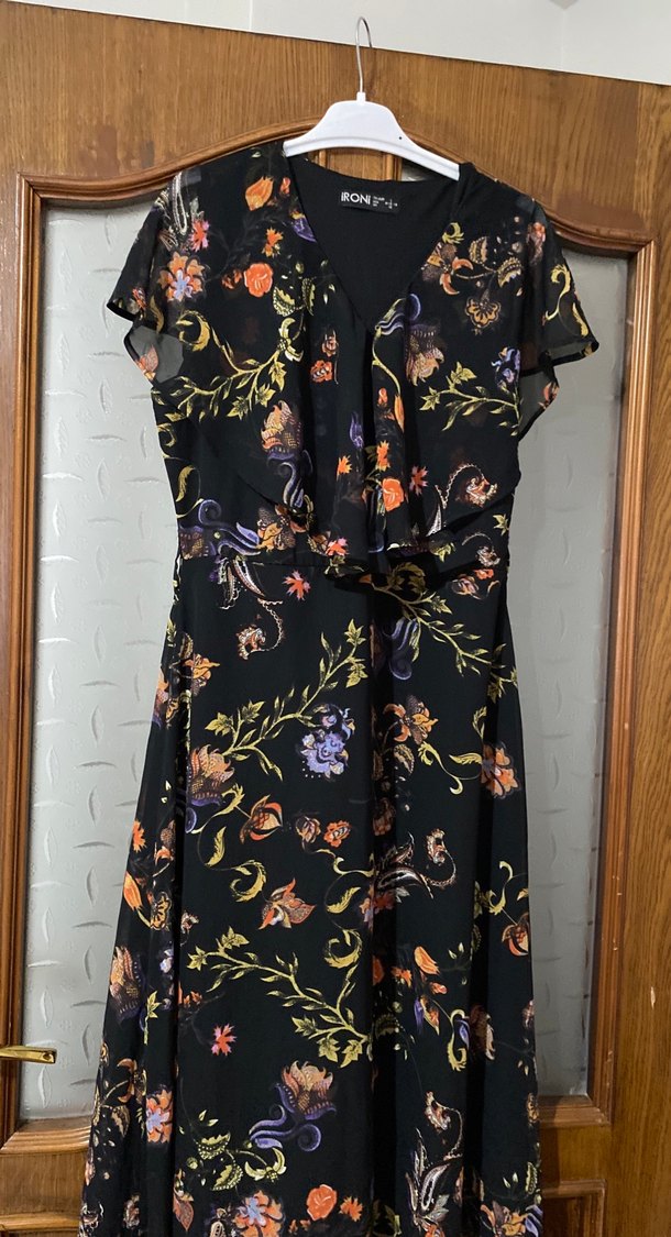 V yaka, kısa kollu, dökümlü uzun bohem elbise. Sentetik kumaştan, koyu renkli çok renkli çiçek baskılı, günlük kullanım için uygun. L beden m de olur