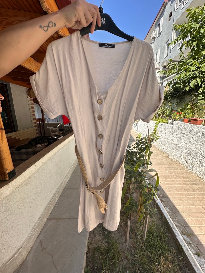 Önü düğmeli, V yaka, kısa kollu, bol kesim bej keten mini elbise. Günlük kullanım için rahat ve şık bir sokak stili. #elbise
