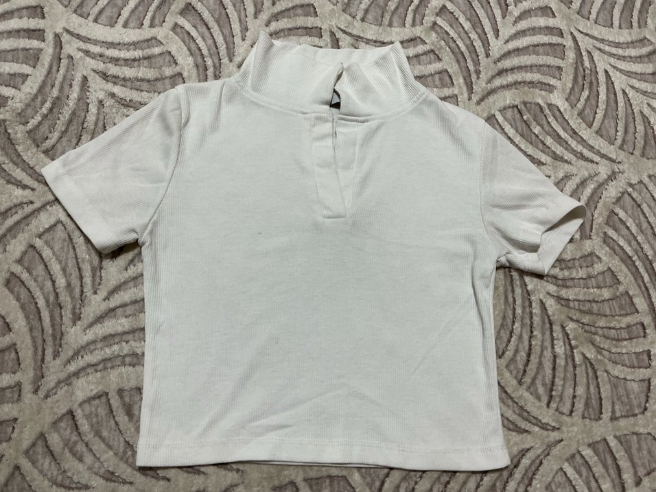 Pamuk kumaştan, V yaka ve kısa kollu, düz beyaz renkte, dar kesim kadın tişörtü. Rahat sokak stili, dış mekan için uygun. Leke var