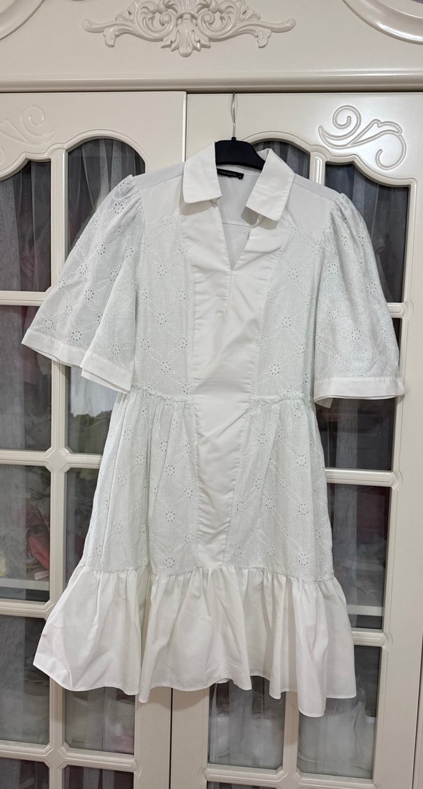 Yumuşak pamuktan, nakışlı kısa kollu beyaz elbise. V yaka ve fırfırlı etek ucu ile bol kesim, bohem Paris tarzı sunar. Günlük kullanıma uygun çok şık ve sıfırdan farksız . Pamuklu gibi, terletmiyor kumaşı , Gezide giydim marka temsili