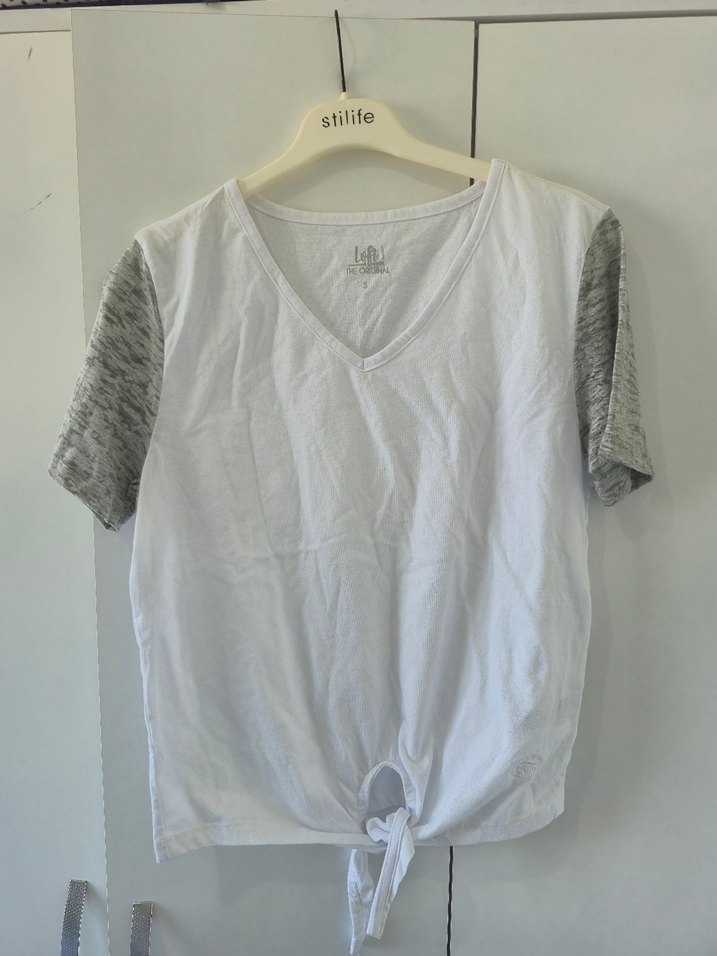 Sıfır ,sorunsuz üründür...S ve M bedeni mevcuttur...Pamuk kumaştan, V yaka ve gri kısa kollu beyaz tişört. Salaş kesim ve ön bağlama detayıyla rahat sokak stili sunar.
