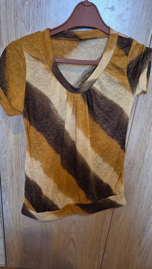 V yaka ve kısa kollu, pileli detaylı, kahverengi tonlarında batik desenli bol kesim hamile tişörtü. Nefes alan keten kumaştan, günlük kullanıma uygun.