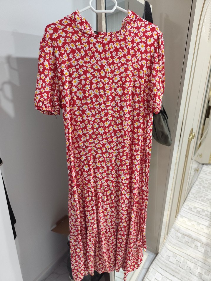 Renkli çiçek desenli, düğmeli, V yakalı kısa kollu bol kesim uzun elbise. Sentetik kumaştan, günlük kullanım için uygun.