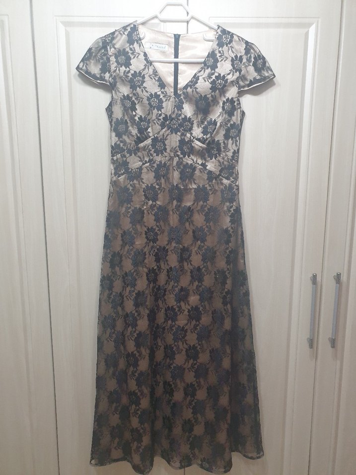 Kayra marka, V yaka ve kısa kollu, koyu bej dantel detaylı, vintage esintili modern klasik tarzda, düğün için uygun uzun ve vücuda oturan elbise.