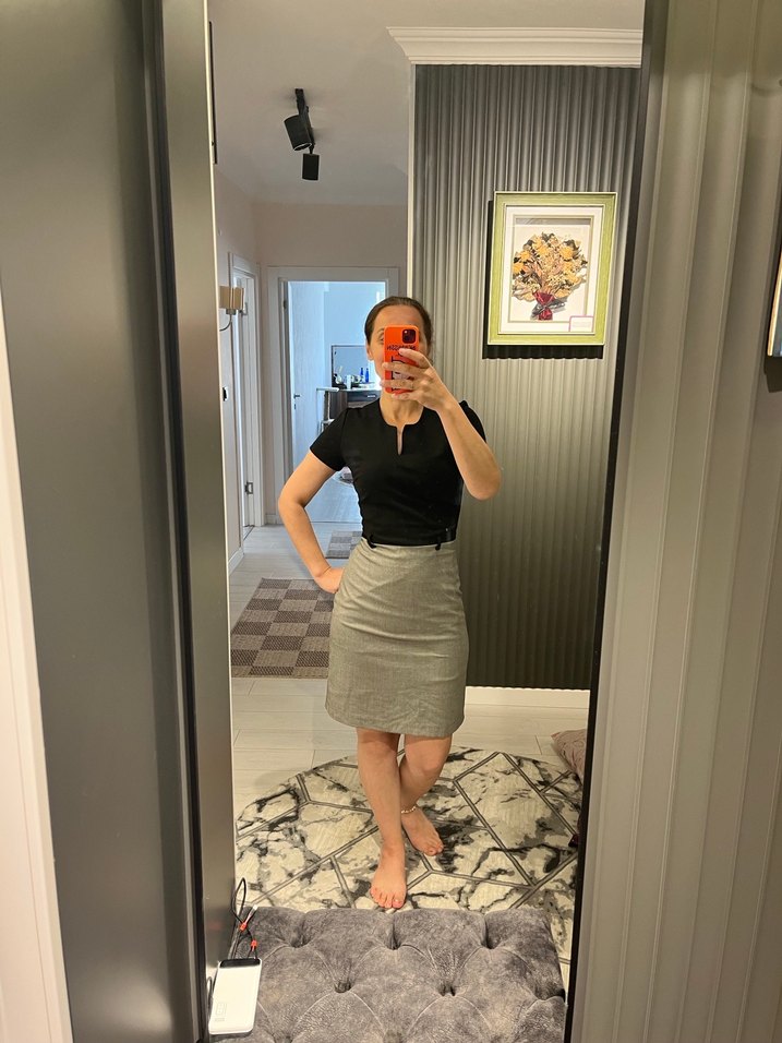 V yaka, kısa kollu ve düz desensiz gri ofis elbisesi. Sentetik dokusu ile rahat, midi boy ve şık, trend bir iş kıyafeti sunar.