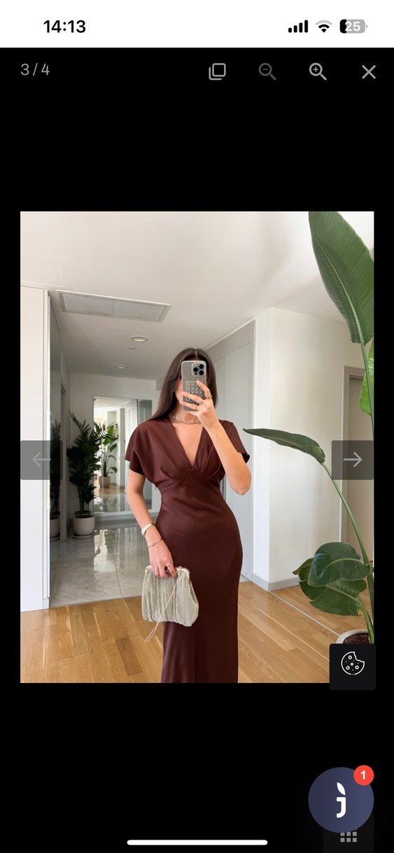 V yaka ve kısa kollu, kahverengi midi elbise, parlak ve ipeksi kumaştan üretilmiştir. Minimalist tasarımı ile ofis için zahmetsiz şıklık sunar.✨