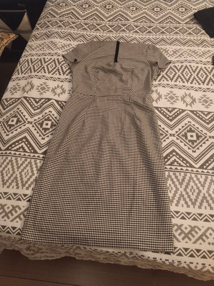 V yaka, kısa kollu, fermuarlı, siyah ve gri kareli vintage desenli uzun, dar kesim elbisedir.