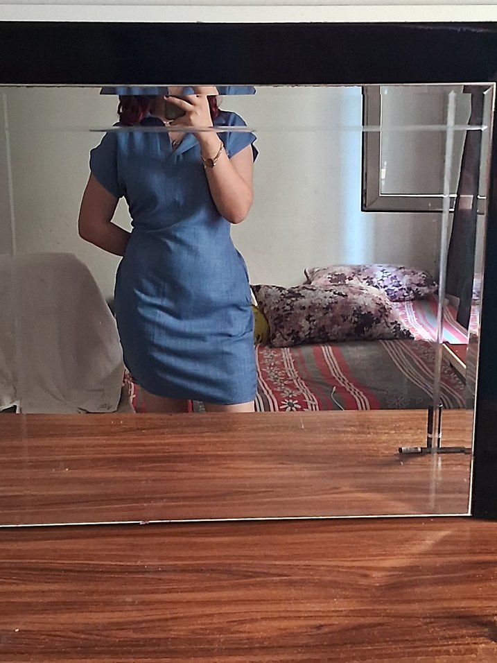 Parlak mavi denim kumaştan, V yaka ve kısa kollu, vücuda oturan midi elbise. Günlük kullanım için zahmetsiz şıklık sunar. bir kere dışarı çıkmak icin giydim
