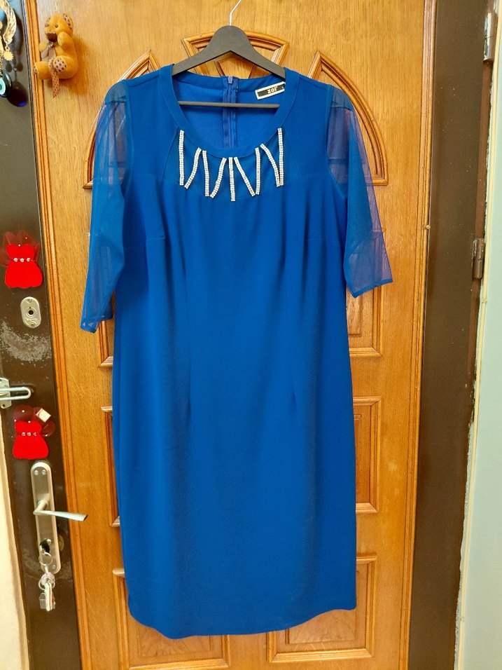 Mavi midi elbise, kısa tül kollar ve V yaka drapeli detaylarla ofis için parlak ve minimalist bir şıklık sunar.