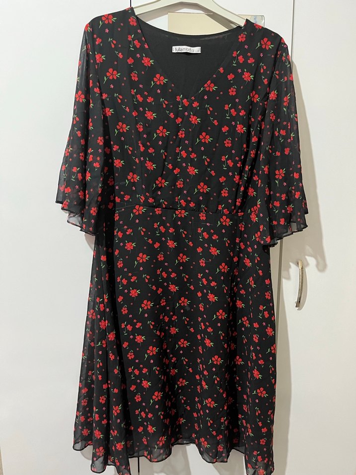 V yaka, kısa kollu, fırfırlı detaylı midi boy, gevşek kesim, koyu renk çiçekli sentetik kumaştan elbise. Romantik akşamlar için uygun.