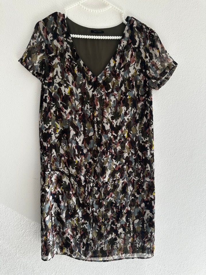 Kısa kollu, V yaka, dökümlü tasarımlı midi boy bol kesim elbise. Çok renkli koyu desenli ve yumuşak sentetik kumaştan üretilmiştir.