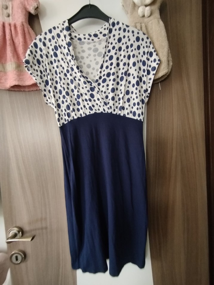 boy 90 cm iki kol arası 42 cm Kadın midi elbise, V yaka ve kısa kollu, bol kesimdir. Üst kısmı puantiyeli drapeli, alt kısmı düz mavi, yumuşak sentetik penye kumaştan yapılmıştır. Günlük kullanım için uygundur.