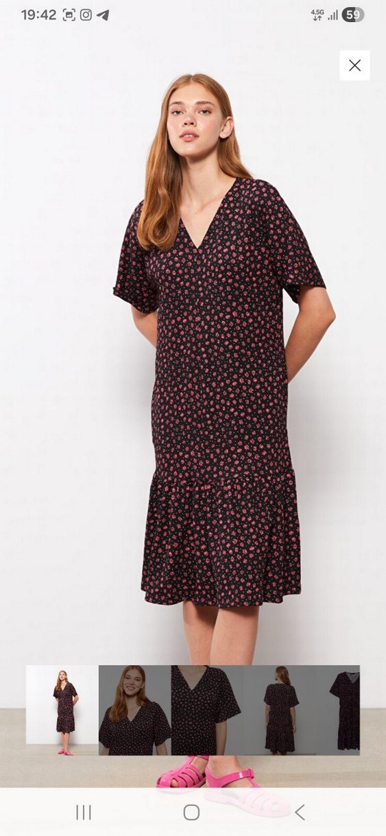 V yaka ve kısa kollu, bol kesim midi elbise, yumuşak sentetik kumaştan, koyu pembe batik desenli ve fırfır detaylıdır.