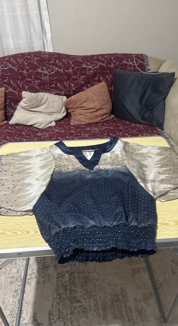 V yaka, kısa kollu, bol kesim mini bluz. Mavi ve gri tonlarında batik desenli, fırfırlı detaylara sahip gündelik rahat bir model.