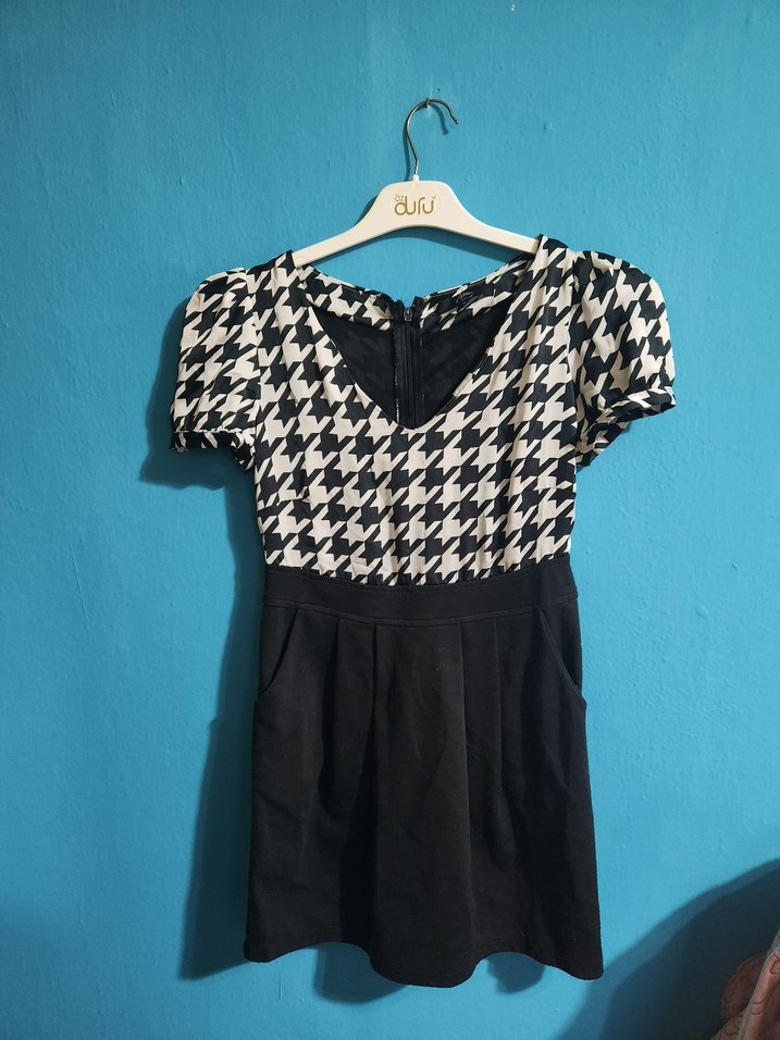 Siyah mini elbise, V yaka ve kısa kollu, bol kesimdir. Üst kısmı siyah-beyaz desenli, etek kısmı pilili ve düz siyahtır. Günlük sokak stili için uygundur.