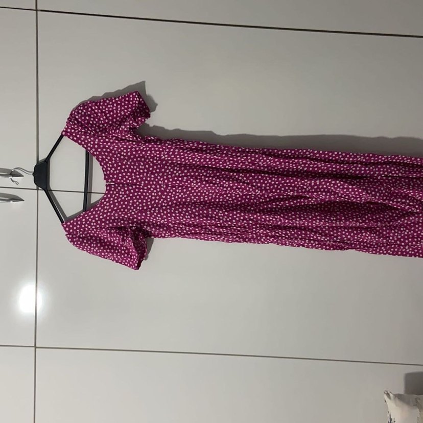 Uzun, v yaka ve kısa kollu, mor tonlarında tie-dye desenli piliseli elbise. Yumuşak sentetik kumaştan, bohem tarzı yansıtır.