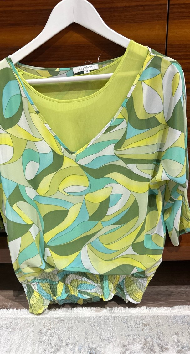 V yaka, kısa kollu ve salaş kesim yeşil bluz, pastel tonlarda tie-dye desenli ve drapeli tasarıma sahip. Yumuşak sentetik kumaştan, günlük kullanım için uygun.