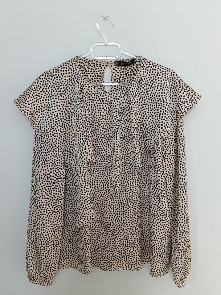 Bej ve gri tonlarda zebra desenli, V yaka kısa kollu, düğmeli, bol kesim kadın bluz. Sentetik kumaştan kısa boyda, günlük rahat kullanım için uygun.