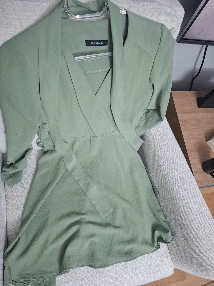 V yaka, uzun kollu, yeşil kısa elbisesi, rahat ve bol kesim, ayarlanabilir kemer detaylı.
