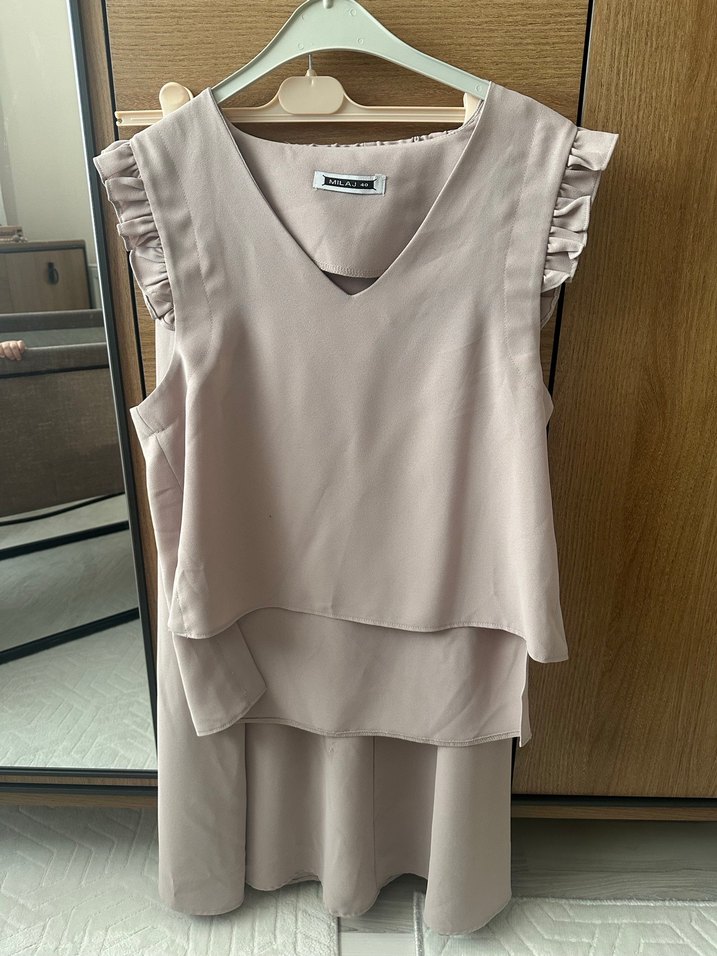Kolsuz, bol kesim, omuzlarda fırfır detaylı bej mini bluz. Düz sentetik kumaştan üretilmiştir. Günlük kullanıma uygundur. Bi kez giyilmiştir ütü izi için uygun fiyatlı