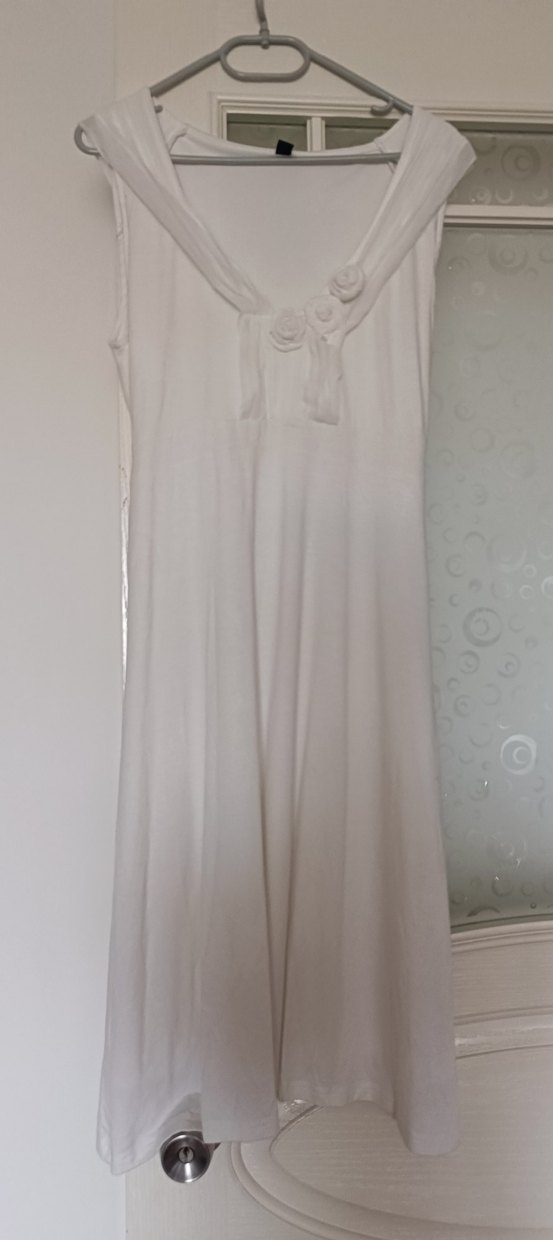 Polyester kumaştan, kolsuz ve V yakalı midi boy elbise, dökümlü tasarıma sahip. Rahat ve bol kesim, sade beyaz renkte, bohem düğün tarzına uygun.