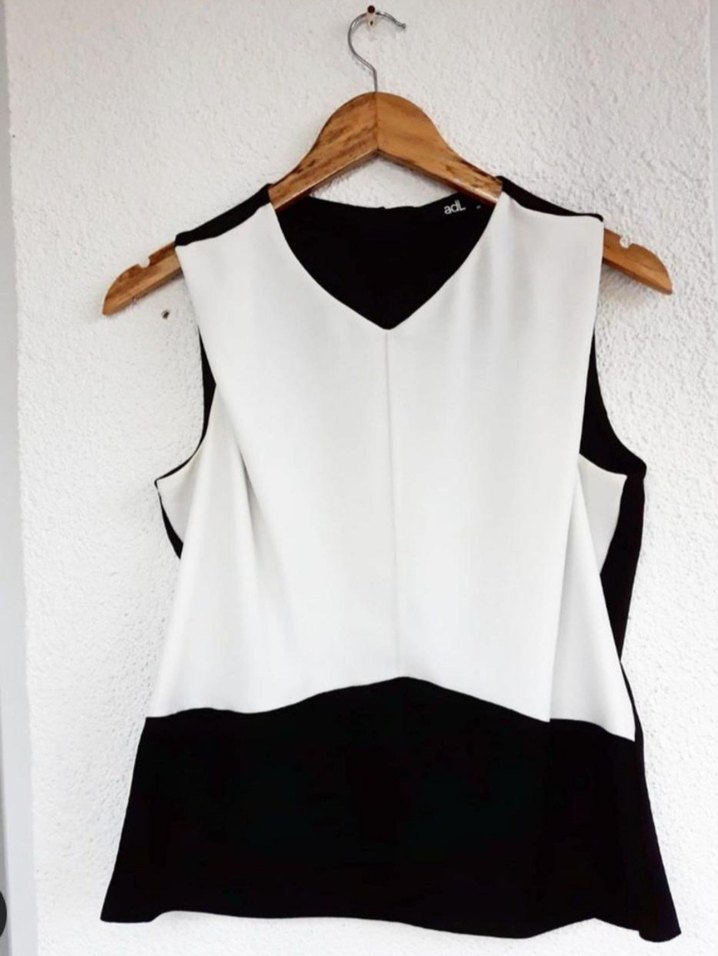 V yaka, kolsuz, bol kesim ve drapeli tasarıma sahip bluz. Beyaz ve siyah renkleri minimalist sokak stiliyle buluşturur. Sentetik kumaştan kısa boy.