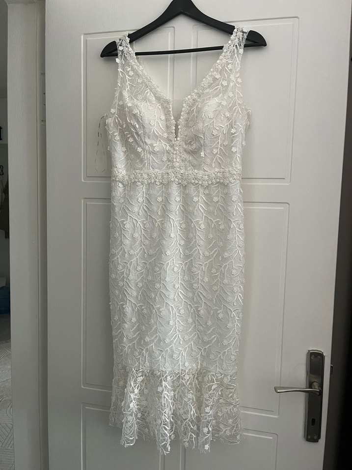 V yaka ve kolsuz, ince işçilikli dantel detaylı, uzun ve vücuda oturan denizkızı kesim gelinlik. Modern klasik Paris tarzı, açık beyaz renkte. 1 kere giyildi 38-40 beden